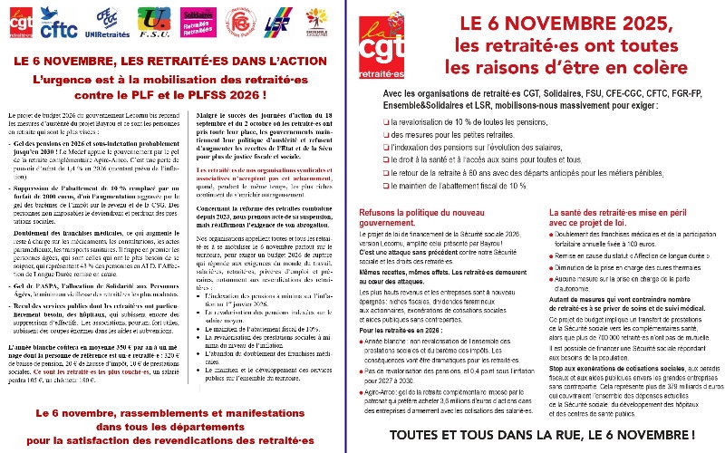 Le projet de budget 2026 du gouvernement Lecornu 2 reprend les mesures d’austérité du projet Bayrou et ce sont les retraités qui sont le plus impactés : Ils ont donc toutes les raisons d'être en colère, ils seront mobilisés le jeudi 6 novembre à l'appel de l'ensemble des organisations de retraités (CGT, Solidaires, FSU, CFE-CGC, CFTC, FGR-FP, Ensemble&Solidaires et LSR), pour exiger :