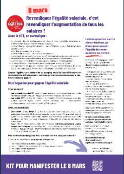 8 MARS - Revendiquer l'égalité salariale, c'est revendiquer l'augmentation de tous les salaires ! [Tract] Publié le 25/02/2026 Pour appeler aux manifestations du 8 mars, journée internationale de lutte pour les Droits des femmes, vous trouverez ci-dessous le tract adaptable et modifiable de la Fédération THCB CGT (pour renseigner heure et lieu, ajouter vos revendications d'entreprise...)Un kit d'actions régulièrement enrichi avec affiches, infographie et... Lire plus |