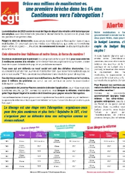 64 ans, c’est toujours non ! [4 pages CGT]Pour s'informer en tant qu'élu.e ou syndiqué.e CGT et informer les salarié.es pour gagner l"abrogation du recul de l’âge de la retraite à 64 ans, affichez sur les panneaux syndicaux et distribuez massivement le 4 pages CGT "64, c'est toujours non".► A consulter également : |