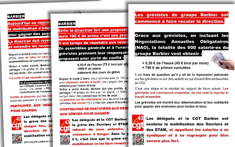 En Haute Loire, chez BARBIER le leader dans la fabrication de films polyéthylènes, le mépris des revendications des salariés lors des NAO avec 0,25 € de l’heure proposé par la direction s’est soldé par un Procès-Verbal de désaccord. Il n’aura pas fallu plus de deux semaines pour que la colère se propage dans les ateliers d’extrusion à Monistrol S/Loire et Ste Sigolène et débouche sur une grève pour des augmentations de salaires. « Grâce à notre travail, Barbier fait des profits, il faut mieux les partager » réclament les grévistes dans les tracts distribués. La détermination des près de 150 ouvriers et ETAM mobilisés avec l’appui du syndicat THCB 43, de l’UD et de la fédération a forcé la direction à reprendre les négociations. Au bout de 5 jours, malgré le chantage sur le cours du pétrole suite à la guerre en Iran, les intimidations voire les menaces sur les intérimaires et les salariés, les élus CGT ont arraché, en incluant les NAO, +0,30 €/heure (soit 45 euros brut par mois) pour toutes et tous, plus 700 € de primes cumulées. C’est le résultat du rapport de force sur une grève qui n’était pas majoritaire. Nos délégués ont valorisé ces avancées pour les 600 salarié·es du groupe en faisant de nouveaux syndiqué·es afin d’être encore plus forts à l’avenir. Ils ont aussi convaincu des sympathisant·es de venir renforcer la liste de candidat·es CGT aux prochaines élections CSE.
